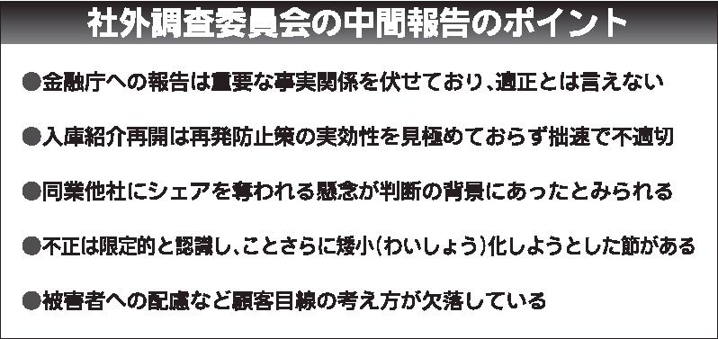 ビッグモーター(和泉伸二社長、東京都多摩市)の自動車保険金の不正請求問題で、同社と親密な関係にあった損害保険ジャパンの対応を調べていた社外調査委員会の中間報告書が10日、公表された。ビッグモーターの組織的不正を把握していたのに、同社との取...