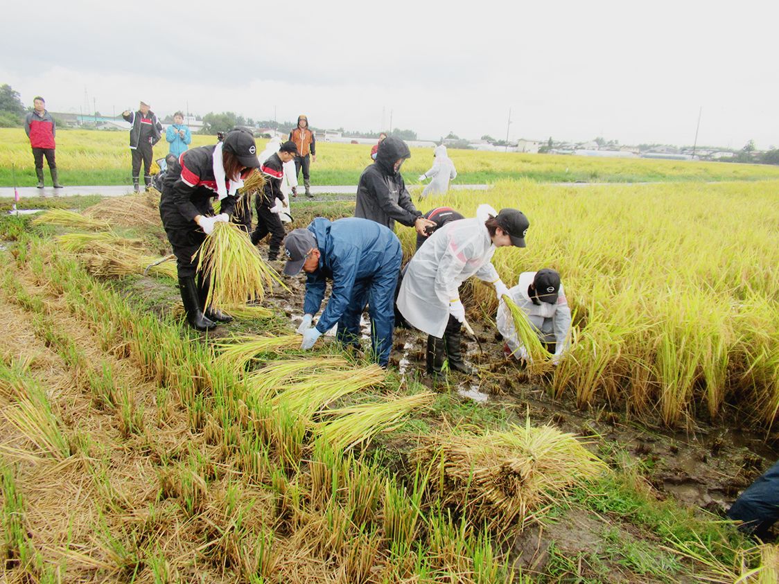山形日産(小関眞一社長)を中核に事業を展開する山形日産グループは、昨年から社内行事の一環として米づくりに取り組んでいる「日産元気米プロジェクト」が実りの秋を迎えた。小関社長や社員ら16人が参加し、山形市の田んぼで稲刈り作業に汗を流した=写...