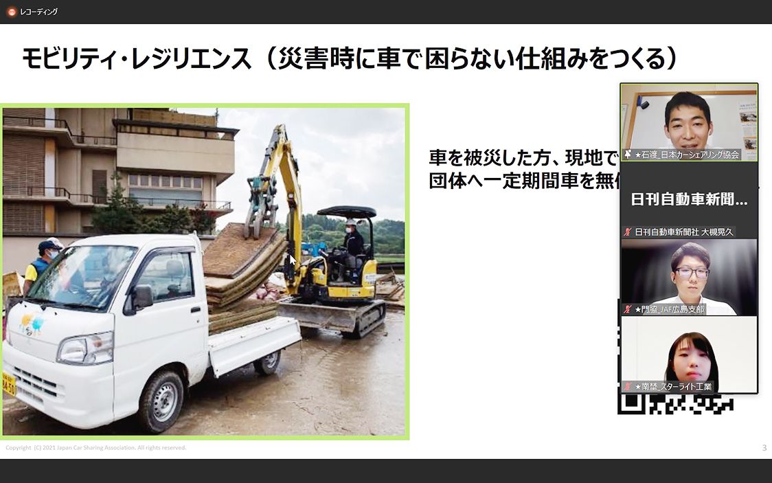 日本自動車連盟(JAF)広島支部(松田哲也支部長)は、日本カーシェアリング協会(吉澤武彦代表理事)とスターライト工業(西郷隆志社長)の3社・団体共催で「災害による車の被災で困らない社会をつくる」をテーマにオンラインシンポジウムを開催した=...