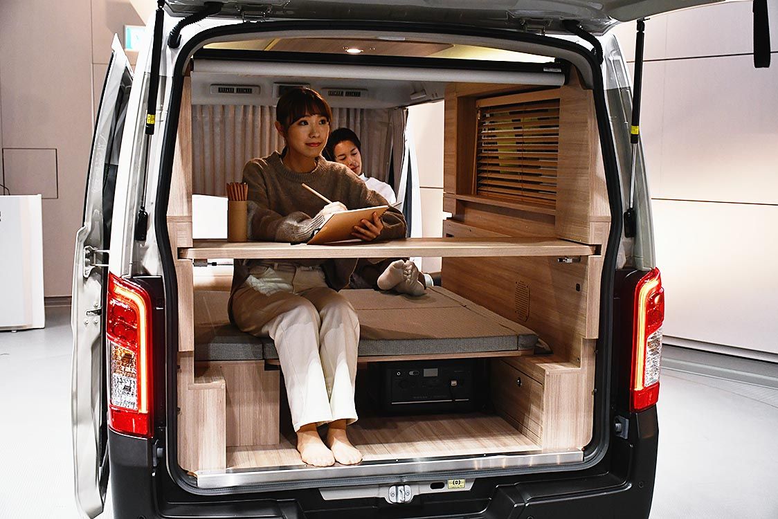 車中泊仕様車は「東京オートサロン2022」でコンセプトカーとして展示。コロナ禍でキャンピングカー需要が高まっていることから、市販化を決めた。車内はベッドとテーブルの組み合わせで、「リビングルームモード」や「ベッドルームモード」などに変更することができる。