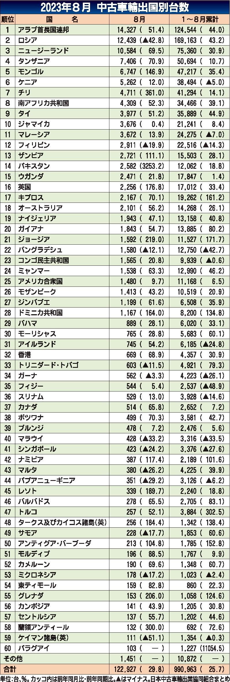 日本中古車輸出業協同組合(JUMVEA、佐藤博理事長)がまとめた2023年8月の中古車輸出台数(車両価格20万円以上)は、前年同月比29・8%増の12万2927台と11カ月連続で増加した。 仕向け地別では、禁輸対象車拡大が適用されたロシア...