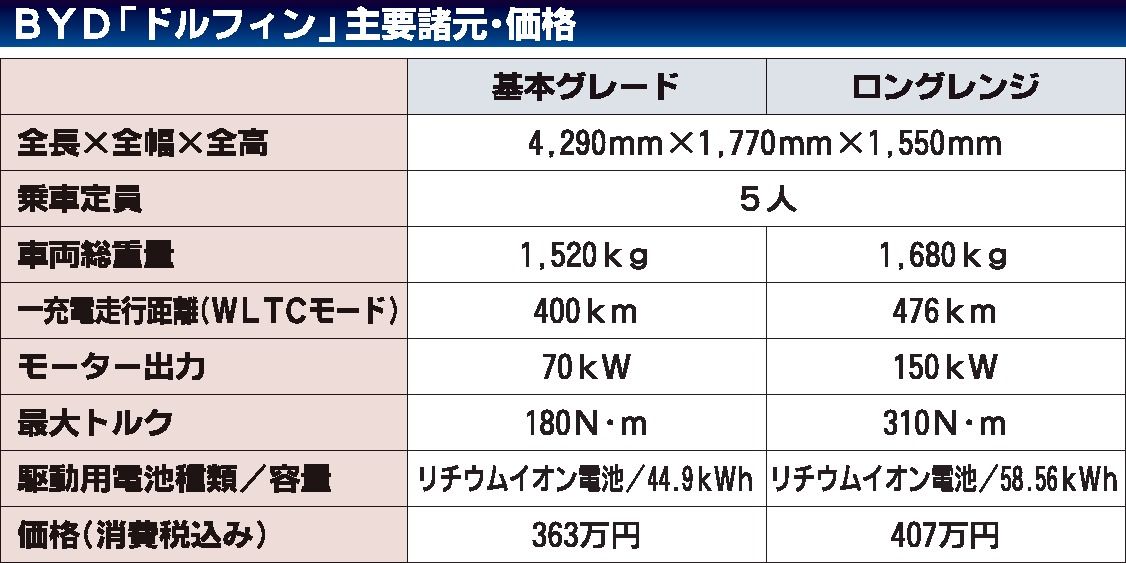 中国の比亜迪(BYD)の日本法人BYDオートジャパン(東福寺厚樹社長、横浜市神奈川区)は、新型のコンパクト電気自動車(EV)「ドルフィン」を9月20日に発売した。車両価格は基本グレードが363万円(消費税込み)で、国の補助金を差し引くと実...