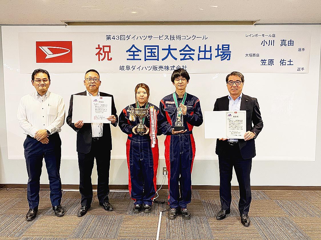 【岐阜】岐阜ダイハツ(佐藤哲也社長)は、「第54回サービス技術コンクール中部地区大会」に出場し、静岡愛岐グループで優勝を果たした=写真。中部地区のダイハツ販売会社4社から2人1組で8人が参加し、接客から故障診断、点検などの日常整備業務の技...