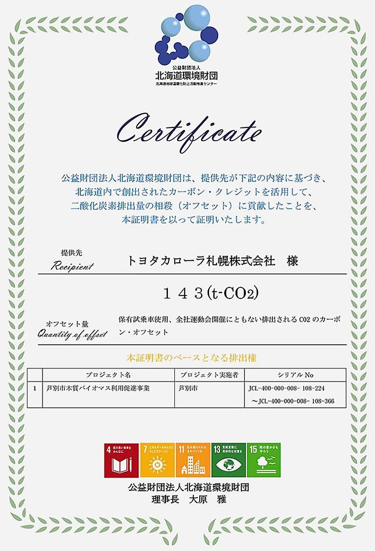 カーボンニュートラル(温室効果ガス排出実質ゼロ)への機運が高まる中、トヨタカローラ札幌(田中浩至社長、札幌市豊平区)は、持続可能なクルマ社会の形成に取り組んでいる。自動車の走行で排出される二酸化炭素(CO2)を、排出権(クレジット)で相殺...