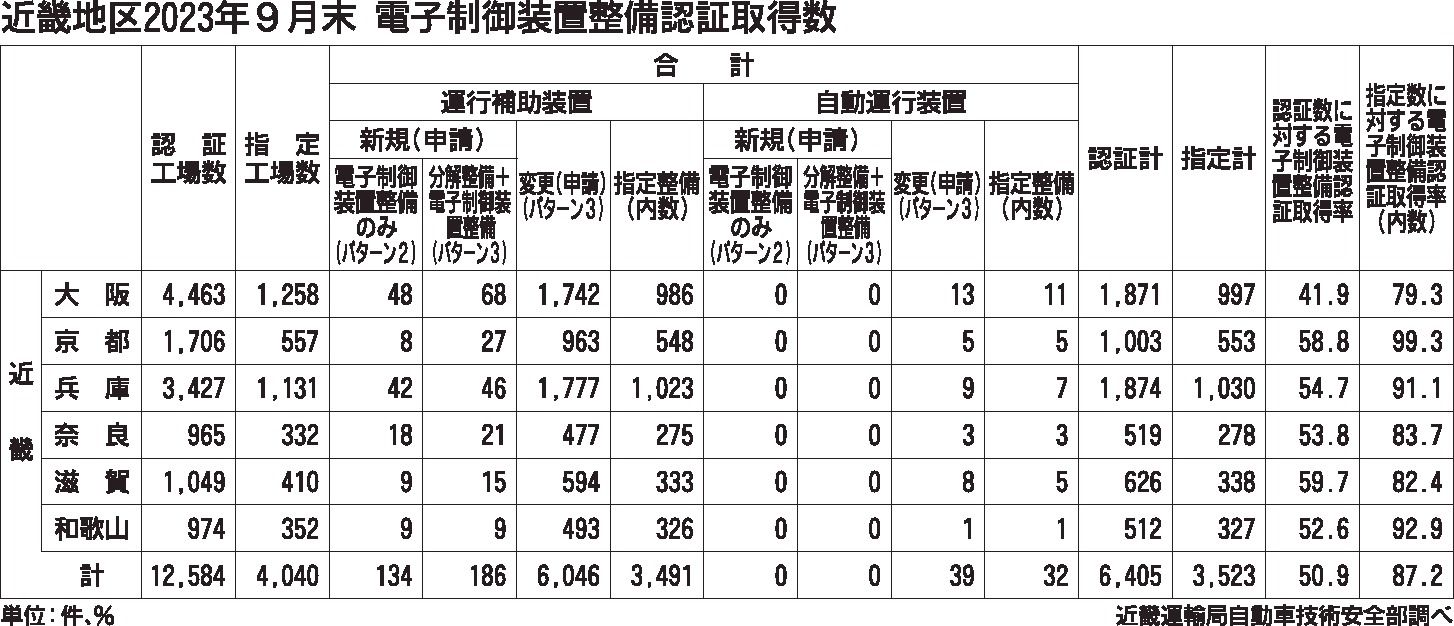 「電子制御装置整備認証」取得の猶予期限切れ半年前でも取得機運盛り上がらず―。 近畿運輸局自動車技術安全部がまとめた9月末の近畿地区の認証取得者数は前年同月比21・7%増の6405件で、認証工場全体の取得率は同9・1㌽増の50・9%だった。...