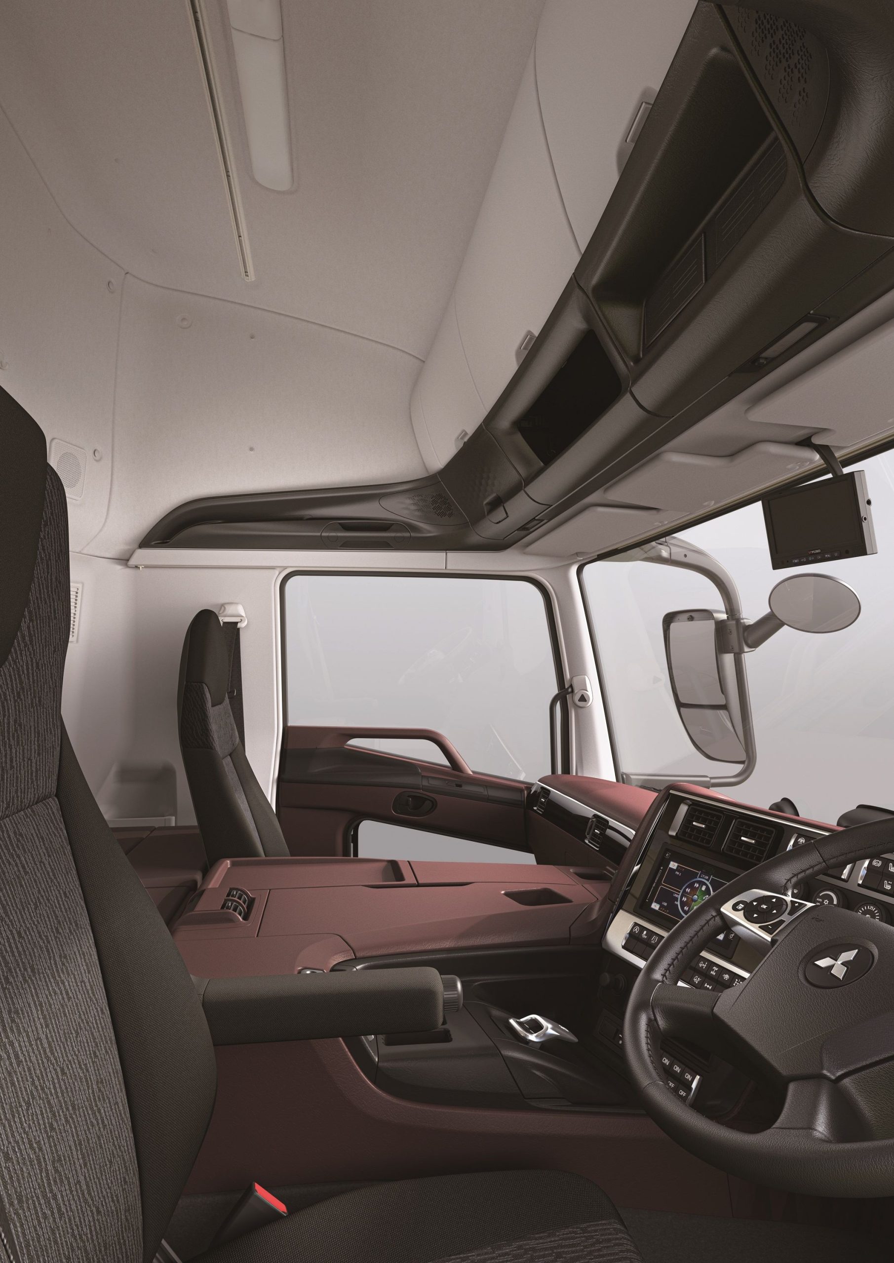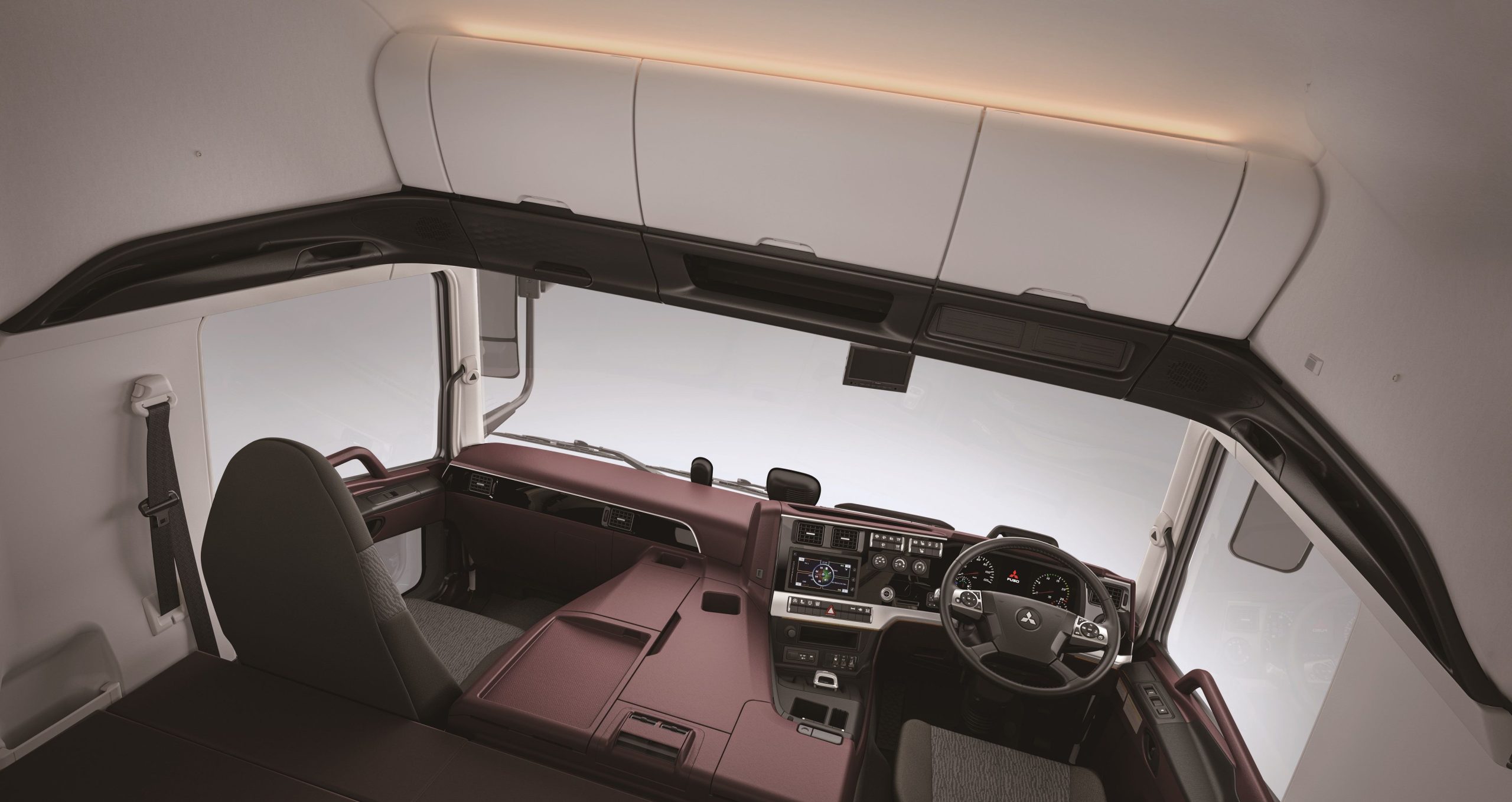 6年ぶりの全面改良となる新型モデルは、ユーザーの利便性と経済性を高めた。キャビンから荷箱にかけて空気を流れやすくするため、キャビンのルーフを高くする「スーパーハイルーフ」を採用。エンジンは、従来モデルから設定している総排気量7.7リットルと10.7リットルに加え、排気量12.8リットルを追加した。車内空間では、前方ルーフ部分に大容量の収納スペースを設置し、乗員の利便性を高めた。