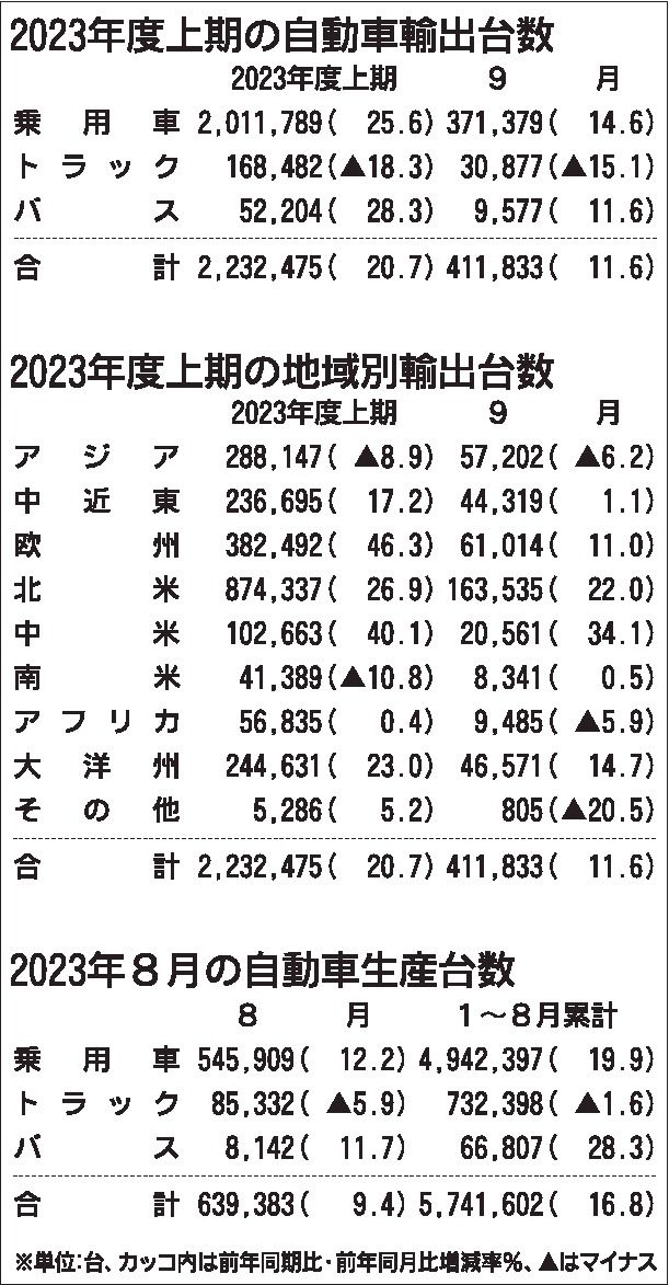 日本自動車工業会(豊田章男会長)が31日発表した2023年度上期(4~9月)の輸出台数は、前年同期比20.7%増の223万2475台となり、同期として3年連続で増加した。コロナ禍前の19年度上期実績(238万8534台)には届いていないが、部品不足の緩和で国内生産が回復し、輸出台数も大幅に増加した。