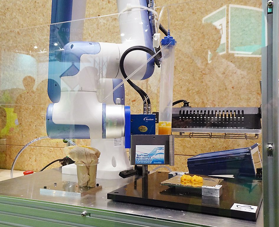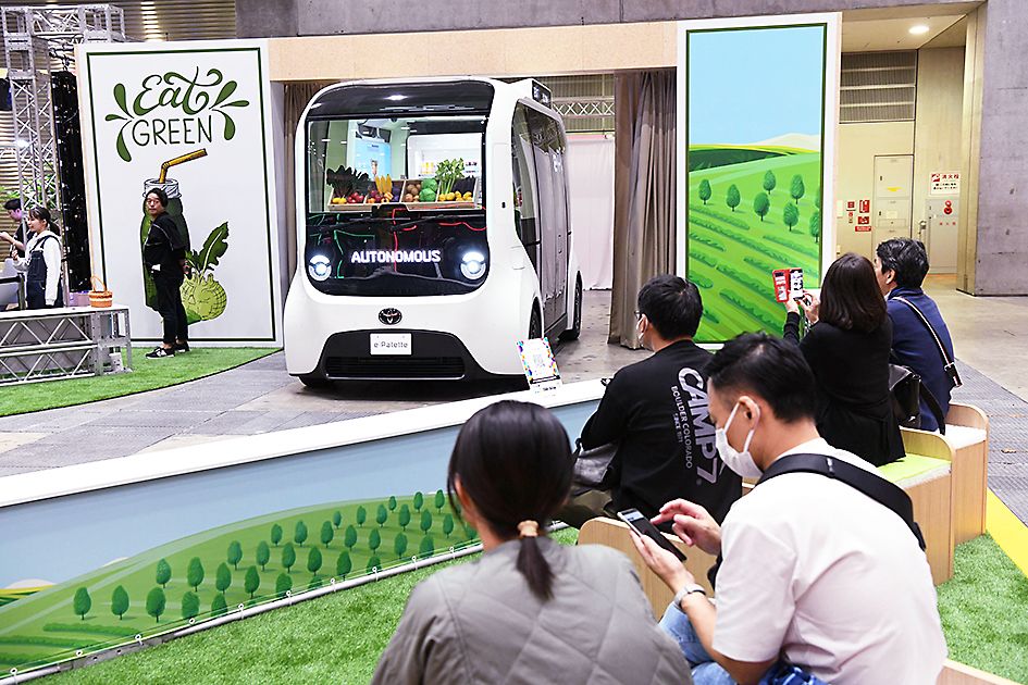 「フード」ゾーンには、アイシンの給仕ロボット「ピーボ」やトヨタの自動運転車「e-パレット」を活用した無人店舗など食に関するモビリティが展示されている。運ぶだけではなく、調理ロボットも並んでいる。山形大学は食の3Dプリンターを展示し、食べられるウニを造形していた。どこでも同じ味を再現したり、アレルギーを起こす食材を別の食材に再現したりと食の可能性を広げているようだ。近い将来にe-パレットが自宅までやってきて、出張3Dプリンター寿司なるものが登場する日も近そうだ。