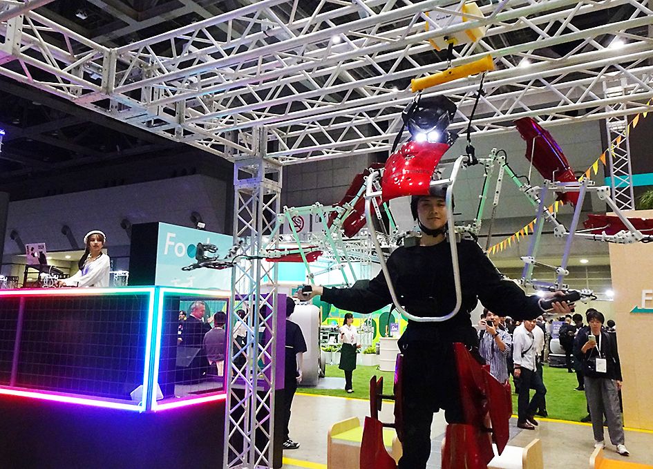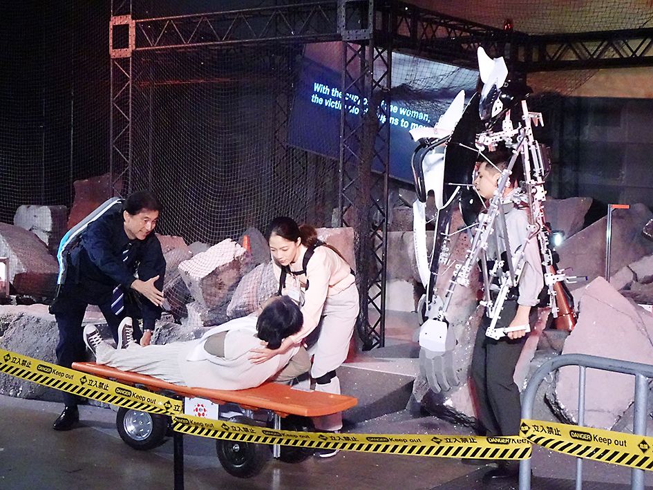 「エマージェンシー」ゾーンでは映画「ゴジラ」とコラボレーションしている。ゴジラが襲来して災害が発生する設定のショーでは、さまざまなモビリティが活躍する場面を描いている。電気自動車(EV)による給電をはじめ、瓦礫も厭わないアトラックラボのクローラー駆動ロボット「AT-4WDクローラー」、特に異彩を放つのはロボットライドの装着型ロボット「スケルトニクス」だ。体に装着する3mの機体が人の身体動作をサポーとして力を拡大する。瓦礫風の重いものも難なく動かす雄姿を見ているときは、まさか次の「プレイ」ゾーンでDJの音楽に合わせて踊るスケルトニクスの姿は想像できないだろう。