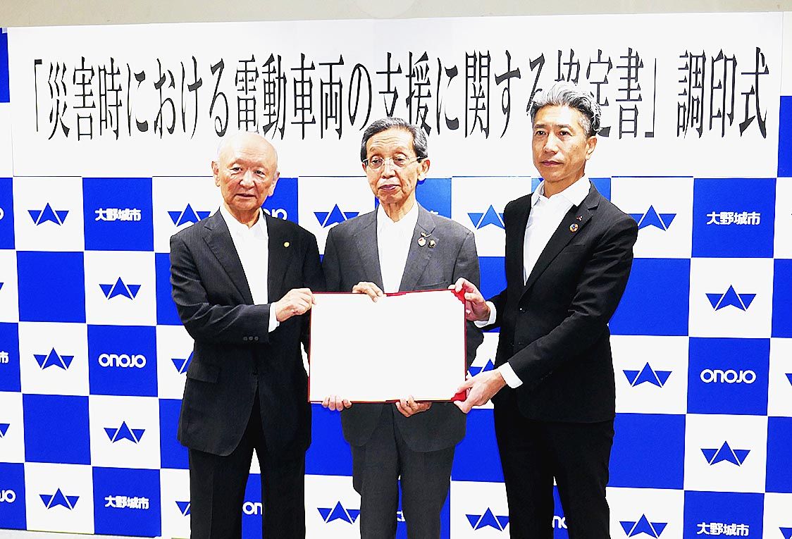 九州三菱(牟田弘昭社長)と三菱自動車工業、大野城市の3者は、「災害時における電動車両の支援に関する協定」を結んだ=写真。災害時に同市の要請に応じて、九州三菱と三菱自が協力して電動車両を提供し、電力インフラの確保などに役立ててもらう。 同市...