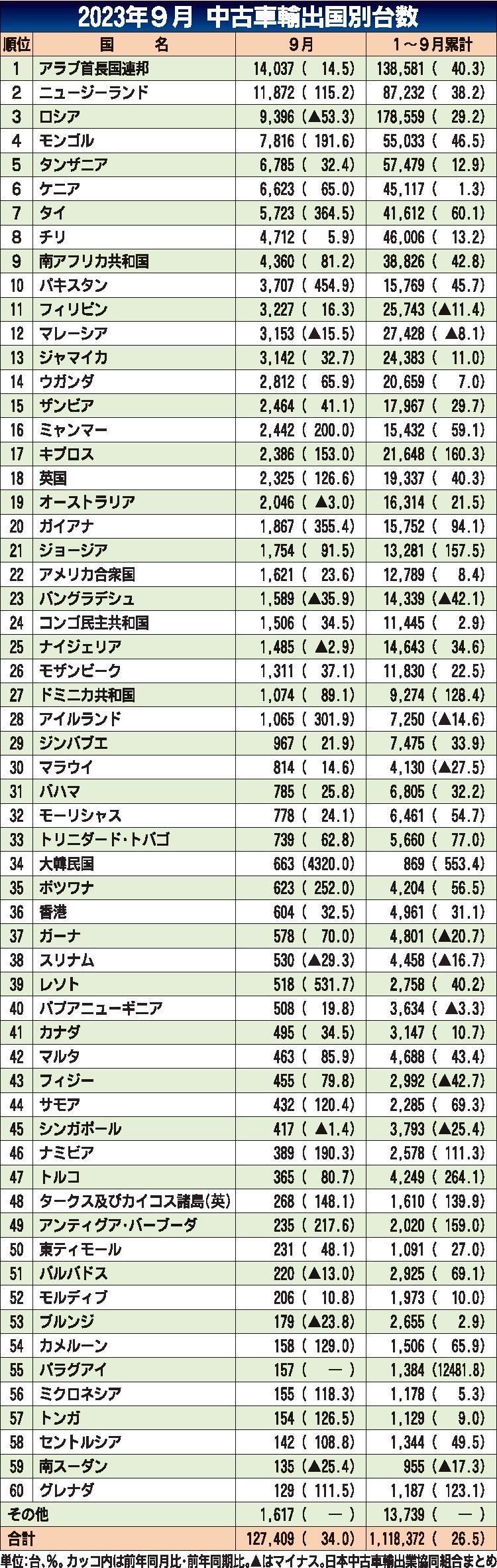 日本中古車輸出業協同組合(JUMVEA)がまとめた2023年9月の中古車輸出台数(車両価格20万円以上)は、前年同月比34・0%増の12万7409台と12カ月連続で増加した。 仕向け地別では、禁輸対象車拡大が適用されたロシアが前年同月に比...
