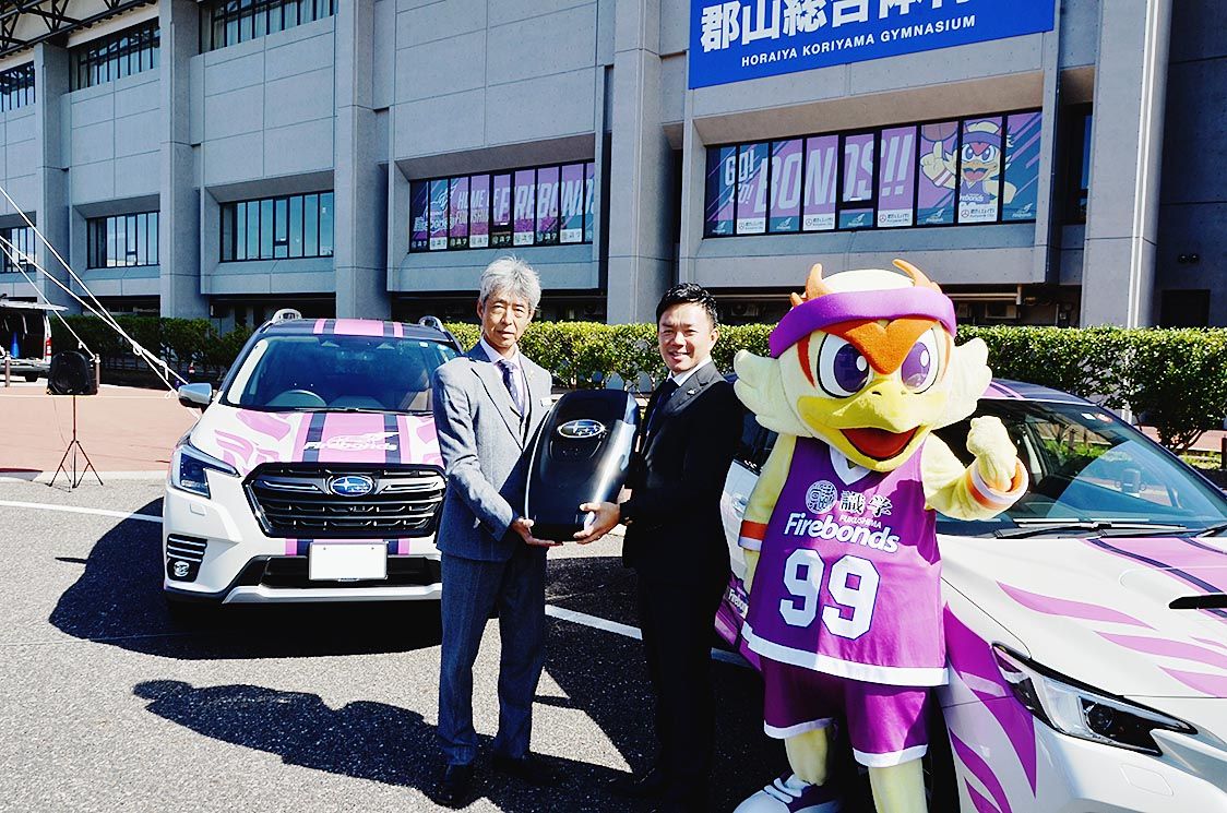 福島スバル(三井高春社長)は、地域貢献の一環としてプロバスケットボールチーム「福島ファイヤーボンズ」に車両を貸与した。郡山市で開催されたチームの今季ホーム開幕戦で貸与式を開催、三井社長からチーム代表の西田創社長にマスコットキーを手渡した=...