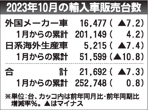 日本自動車輸入組合(JAIA、上野金太郎理事長)が7日発表した2023年10月の外国メーカー車新規登録台数は、前年同月比7.2%減の1万6477台となり2カ月ぶりに前年割れした。前年同月は新車の供給制約が緩和したため登録台数が急伸していたため反動減となったが、コロナ禍前の19年10月(1万6623台)に近い水準を確保した。登録車全体に占める外国メーカー車のシェアは6.8%。また、輸入電気自動車(EV)の販売台数は同39.9%増の1983台で、外国メーカー車に占めるシェアが過去最高の8月(12.1%)に迫る12.0%だった。