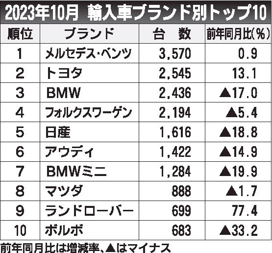 乗用車のブランド別ではメルセデス・ベンツが同0.9%増の3570台で首位を維持。これにBMW、フォルクスワーゲンと続いた。