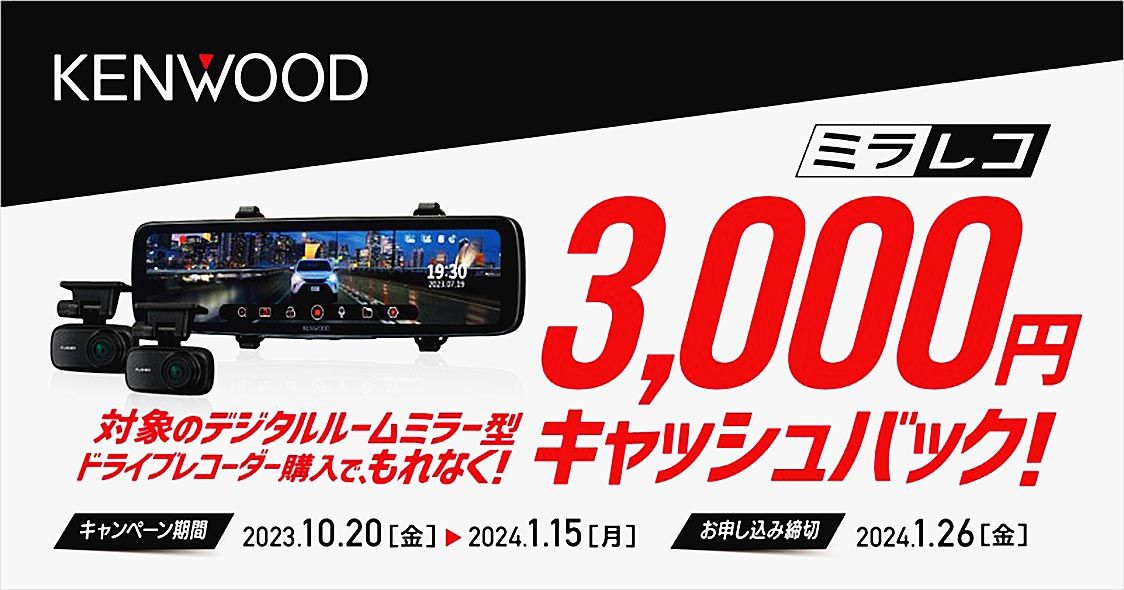 JVCケンウッド(江口祥一郎社長、横浜市神奈川区)は、デジタルルームミラー型ドライブレコーダー「ミラレコ(DRV―EM4800)」のキャッシュバックキャンペーンを開始した。期間中に対象店舗で購入したユーザーがウェブサイトから応募すると、最...