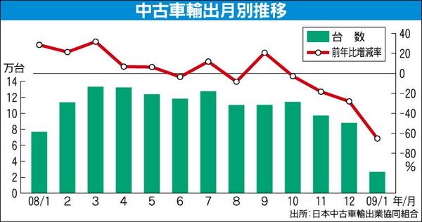 急成長を遂げてきた中古車輸出が転換期を迎えている。日本中古車輸出業協同組合(中輸協、佐藤博理事長)のまとめによると、今年1月の輸出台数は2万6751台で前年同月に比べ65.2%減と大きく落ち込んだ。前年実績割れは昨年10月から4カ月連続で...