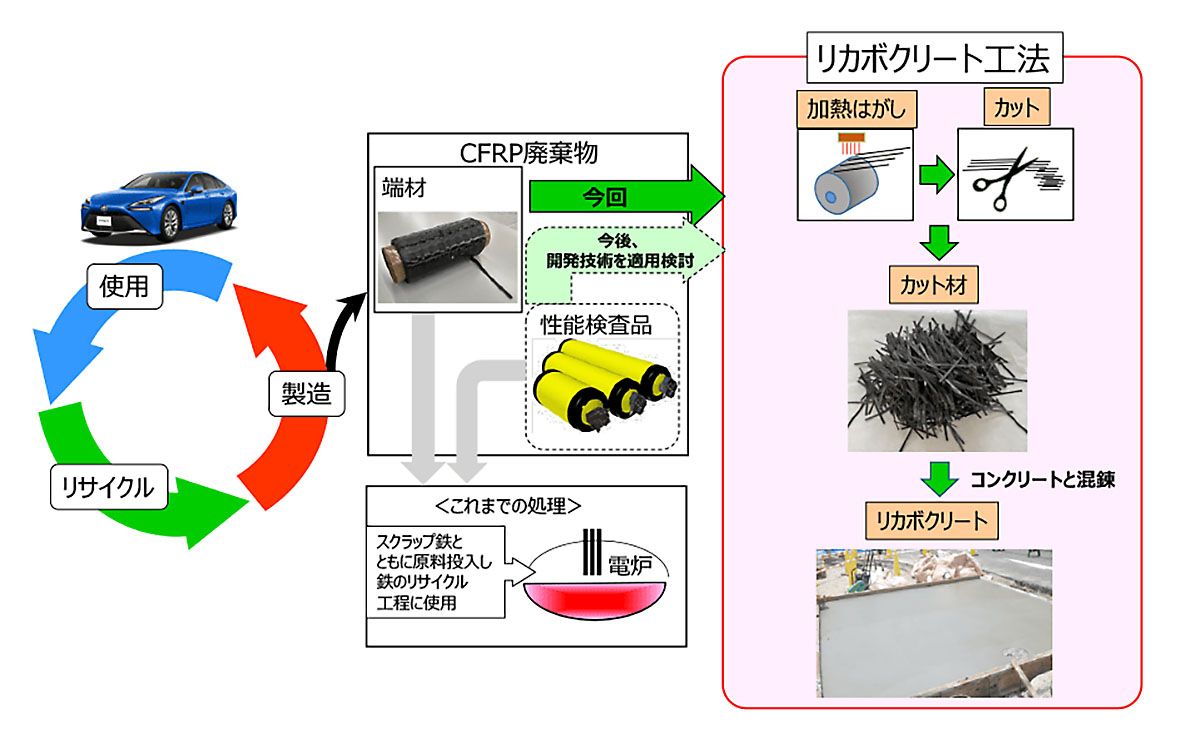 リカボクリート工法は、トヨタ「ミライ」の水素タンクを製造する過程で出るCFRPの端材に独自の熱加工を施すことで、表面層のCFRPをはがせる技術。はがしたCFRPを裁断し、コンクリートと混ぜてひび割れを防いだり、耐久性を高める。コンクリートの補強材にはポリプロピレン製の短繊維が用いられるが、添加量を3分の2に抑えた上で同等以上の圧縮強度を確保した。