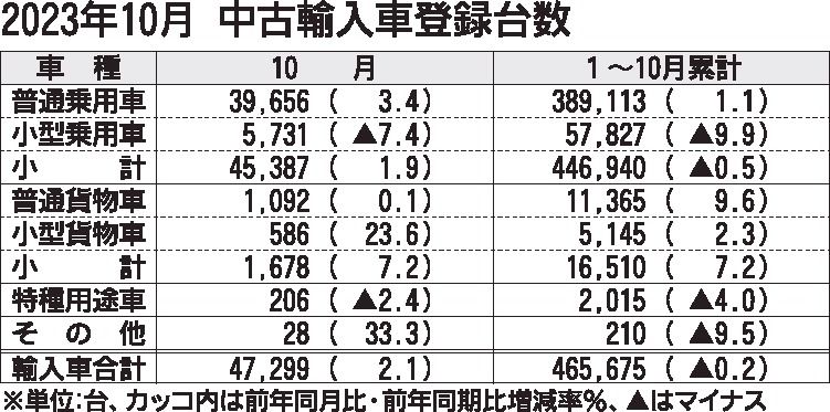 日本自動車輸入組合(JAIA、上野金太郎理事長)が13日発表した2023年10月の中古輸入車登録台数は、前年同月比2・1%増の4万7299台となり、2カ月ぶりに増加した。新車の納期遅延が改善したことで、中古車も商品車の供給が安定化した。全...