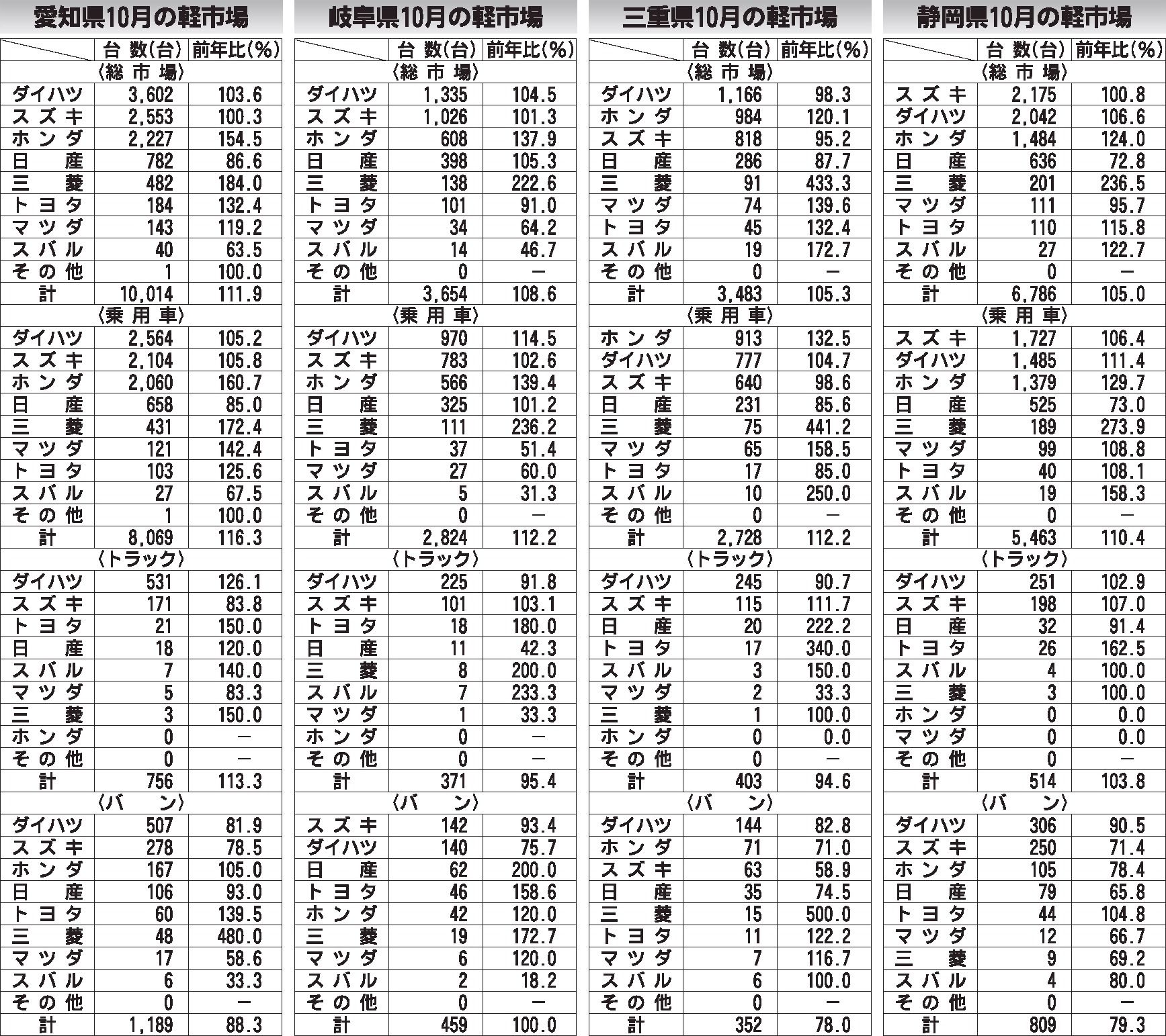 〈中部4県 2023年10月の軽市場〉愛知県/岐阜県/三重県/静岡県