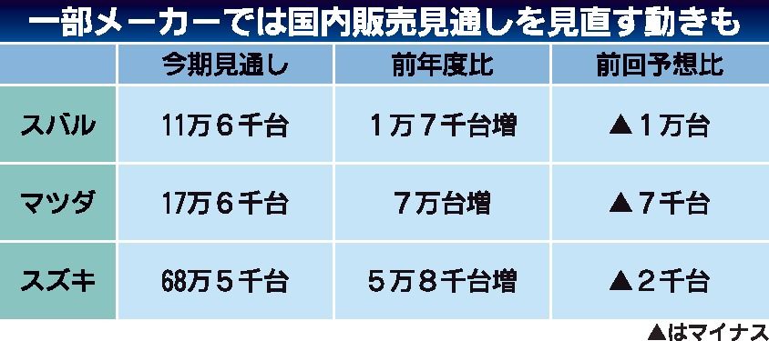 ダイハツ工業を除く国内乗用車メーカー7社のうち、3社が国内販売の今年度見通しを決算発表に合わせて下方修正した。生産制約に伴う受注残の解消が進み、10月までの国内新車販売は14カ月連続で前年同月を上回る。下方修正後の計画も前年度比ではプラス...