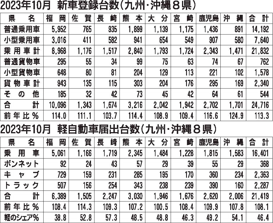 九州・沖縄地区の10月の新車販売台数(登録車と軽自動車合計)は、前年同月比10・8%増の4万6135台となり、14カ月連続でプラス基調を維持した。2桁伸長は3カ月連続。登録車、軽自動車ともに全8県が前年実績を上回った。登録車が全国の伸び率...