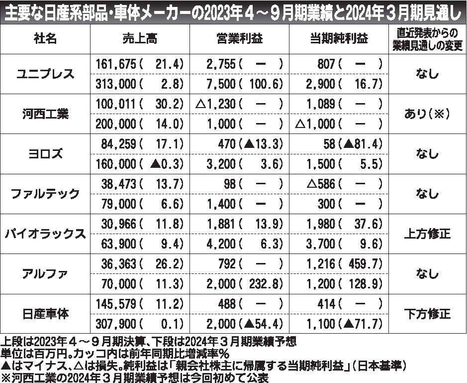 日産自動車を主取引先とする部品・車体メーカー7社の2023年4~9月期業績は全社が増収となり、5社が営業増益(黒字転換含む)を確保した。日産をはじめとする完成車メーカーの生産回復や円安が業績を押し上げた。一方、中国を含むアジアセグメントで...