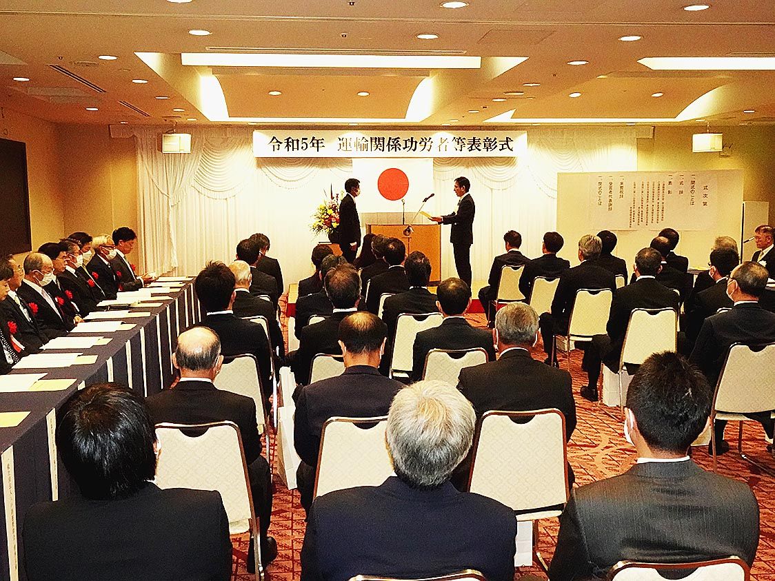 【青森】青森運輸支局(佐々木久哉支局長)は青森市内のホテルで「令和5年運輸関係功労者等表彰式」を開催した=写真。東北運輸局長、支局長表彰合わせて62人が受賞、各優良事業所表彰では15拠点が受賞した。受賞者、来賓、関係者合わせて約80人が出...