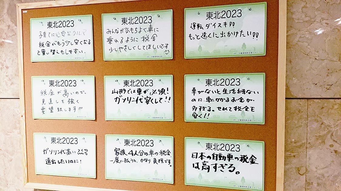 自動車税制改革フォーラムとJAF、ユーザーの声をパネルにして日本自動車会館に展示