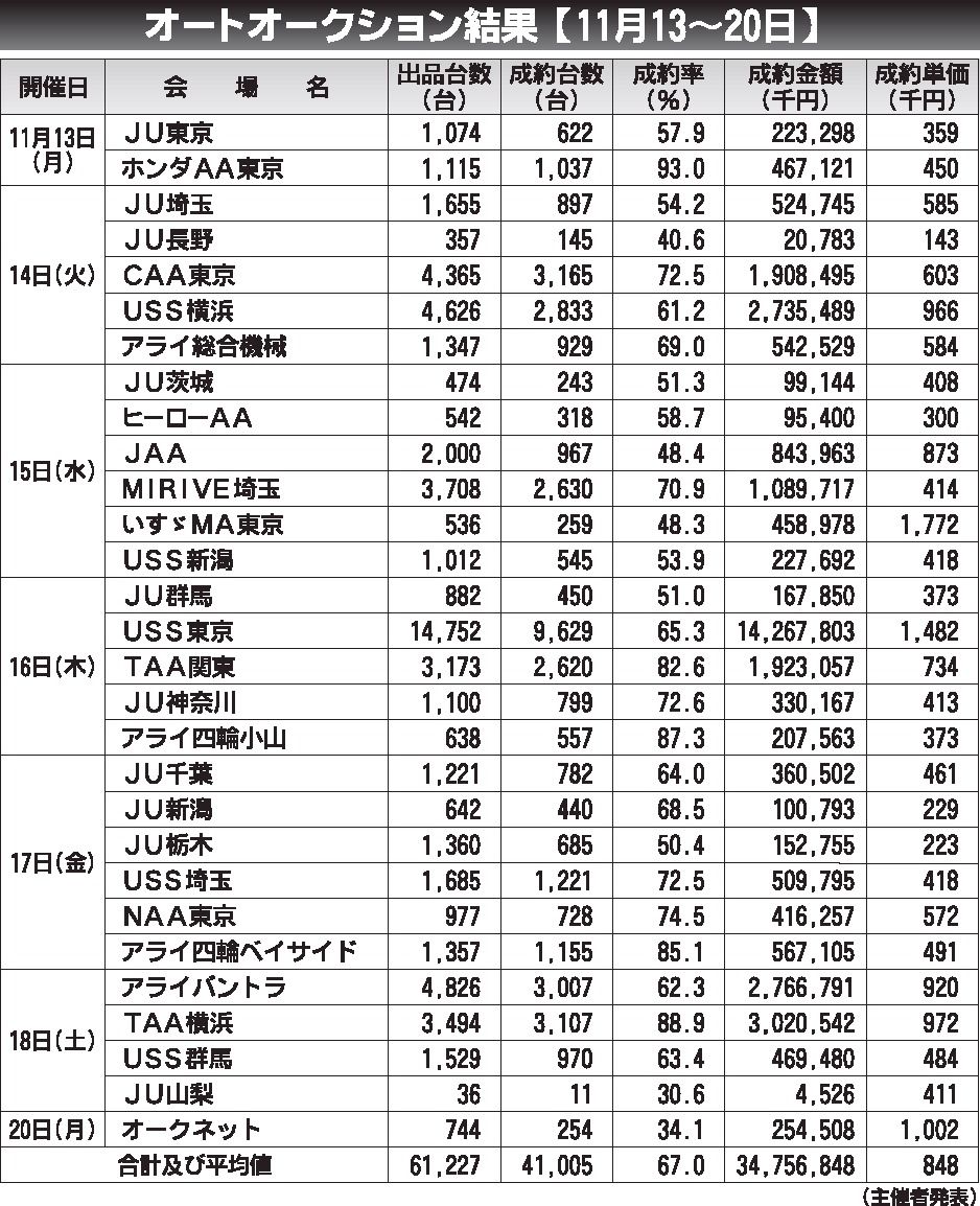 〈オートオークション結果〉首都圏 2023/11/13~20