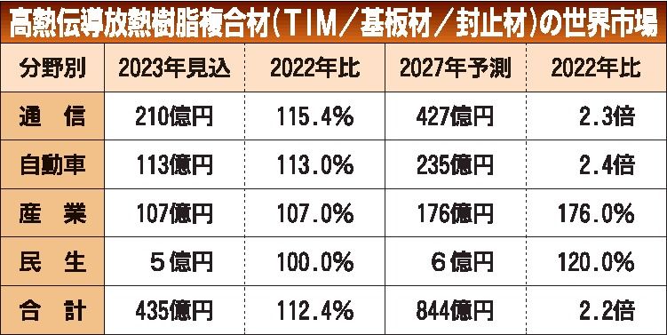 富士経済(菊地弘幸社長、東京都中央区)は、高熱伝導放熱樹脂複合材の世界市場調査の結果をまとめた。電気自動車(EV)など電動化の進展や第5世代通信システム(5G)の普及などにより、2027年には22年比で2・2倍の844億円に市場が拡大する...