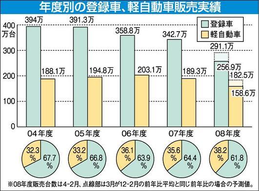 2008年度の軽自動車を除く新車販売台数(登録台数)が1971年度以来、37年ぶりに300万台を割り込む可能性が出てきた。300万台に達するには3月単月で43万1162台(前年比91・4%)の登録台数が必要だが、5カ月にわたり2けた減が続...