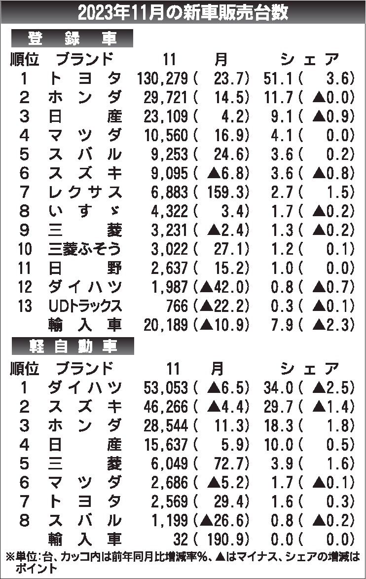 〈2023年10月の新車販売台数〉(登録車、軽自動車)