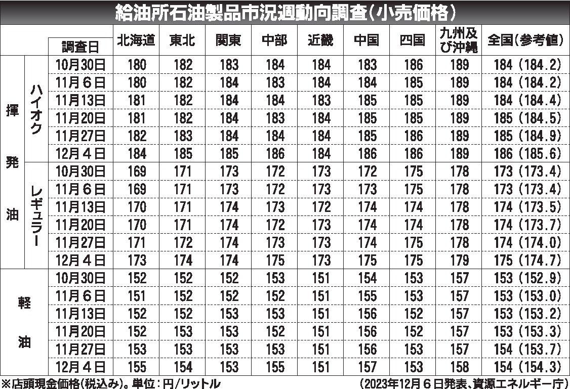 〈給油所石油製品市況動向調査(小売価格)〉2023/10/30~12/4