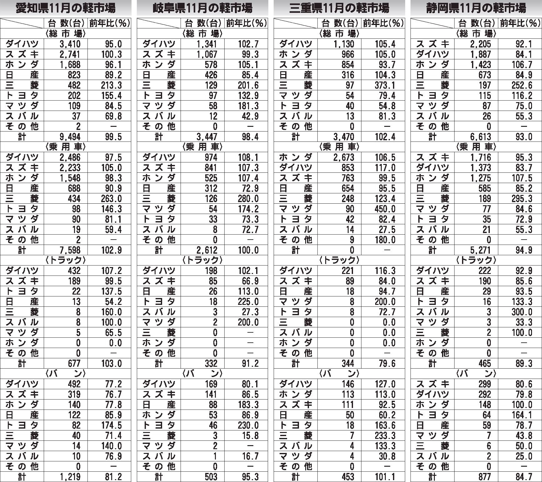 〈中部4県 2023年11月の軽市場〉愛知県/岐阜県/三重県/静岡県