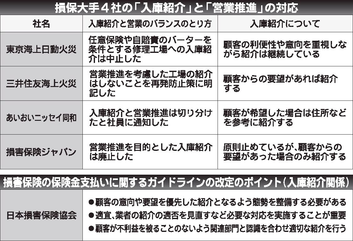 ビッグモーター(和泉伸二社長、東京都多摩市)による自動車保険金の不正請求問題を受け、損害保険業界では特定の整備工場に修理車を誘導する「入庫紹介」と「営業推進(保険販売)」をどのように取り扱っていくかが、信頼回復に向けた焦点の一つとなってい...