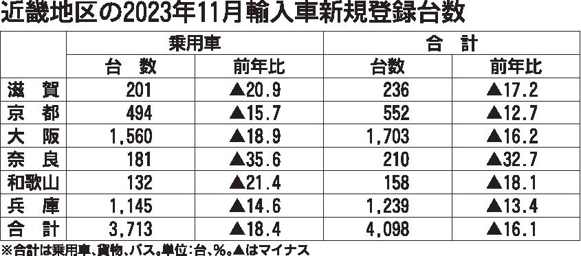 日本自動車輸入組合(JAIA)の発表によると、11月の近畿地区の輸入車新規登録台数(外国メーカー車と日本メーカー車)は、前年同月比16・1%減の4098台と2カ月連続のマイナスだった。20%以上伸長した前年同月の反動もあり今年初の2桁減と...