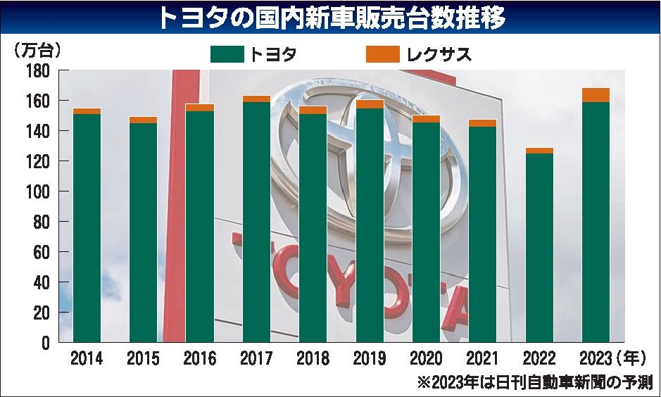 トヨタ自動車が、2024年の国内新車販売見通しを約160万台と系列販売会社に伝えたことが13日までに分かった。国内向けの供給台数を大幅に増やした23年(見通し)比では5%の減少だが、ここ10年では17年、19年に次ぐ高い水準だ。特にレクサ...