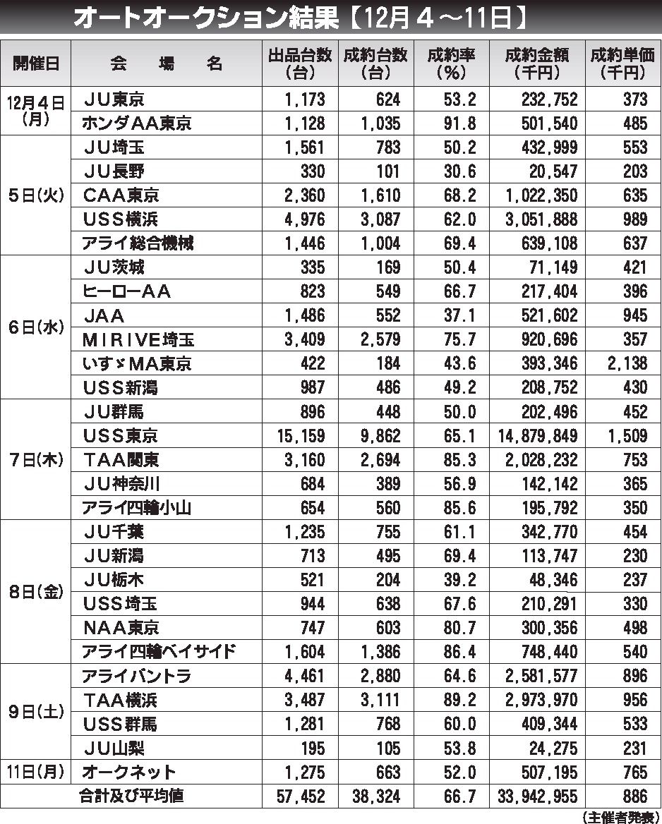 〈オートオークション結果〉首都圏 2023/12/4~11