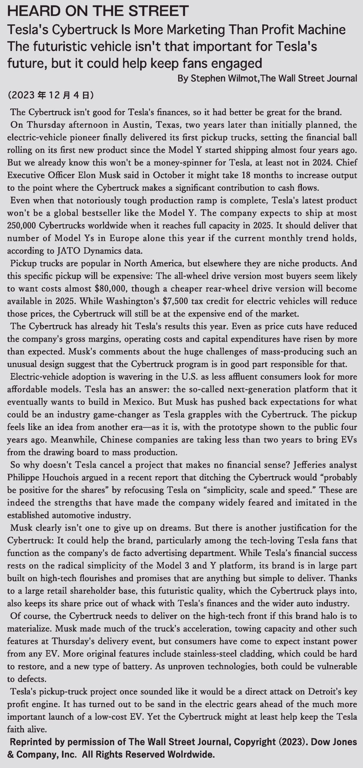 By Stephen Wilmot,The Wall Street Journal 2023 年 12 月 4 日 米テスラの「サイバートラック」は、財務面ではプラスにならない。ならばブランド面に多大なメリットをもたらさなければ困るだろ...