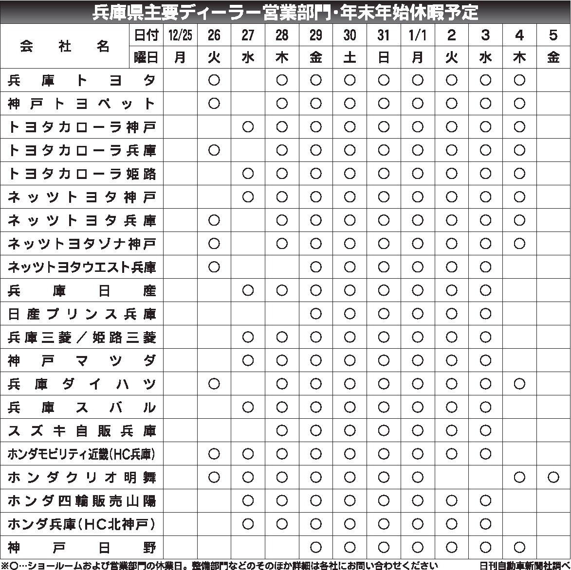 〈兵庫県主要ディーラー営業部門・年末年始休暇予定〉2023/12/25~2024/1/5