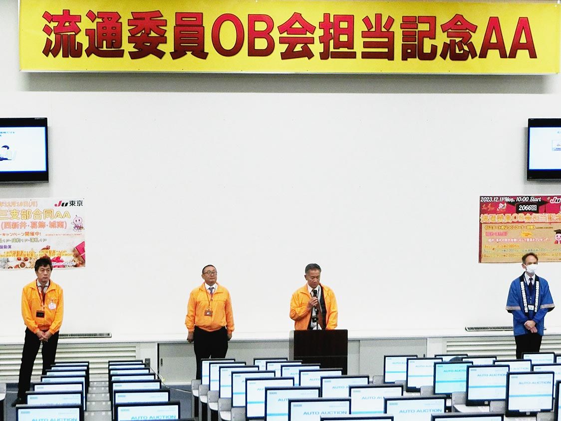 【東京】JU東京(萩田典雄理事長)は、中古車オークション(AA)「流通委員OB会担当記念AA」を開催した=写真。出品台数は1434台、成約率は60・1%だった。 競り開始前のセレモニーで流通委員OB会の黒田泰男会長は「OB会担当記念オーク...