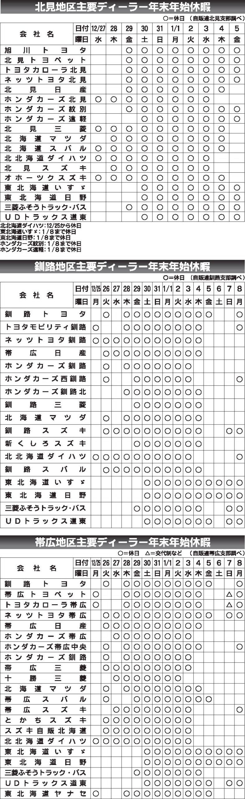 〈主要ディーラー年末年始休暇〉北見地区/釧路地区/帯広地区(2023/12/25~2024/1/8)