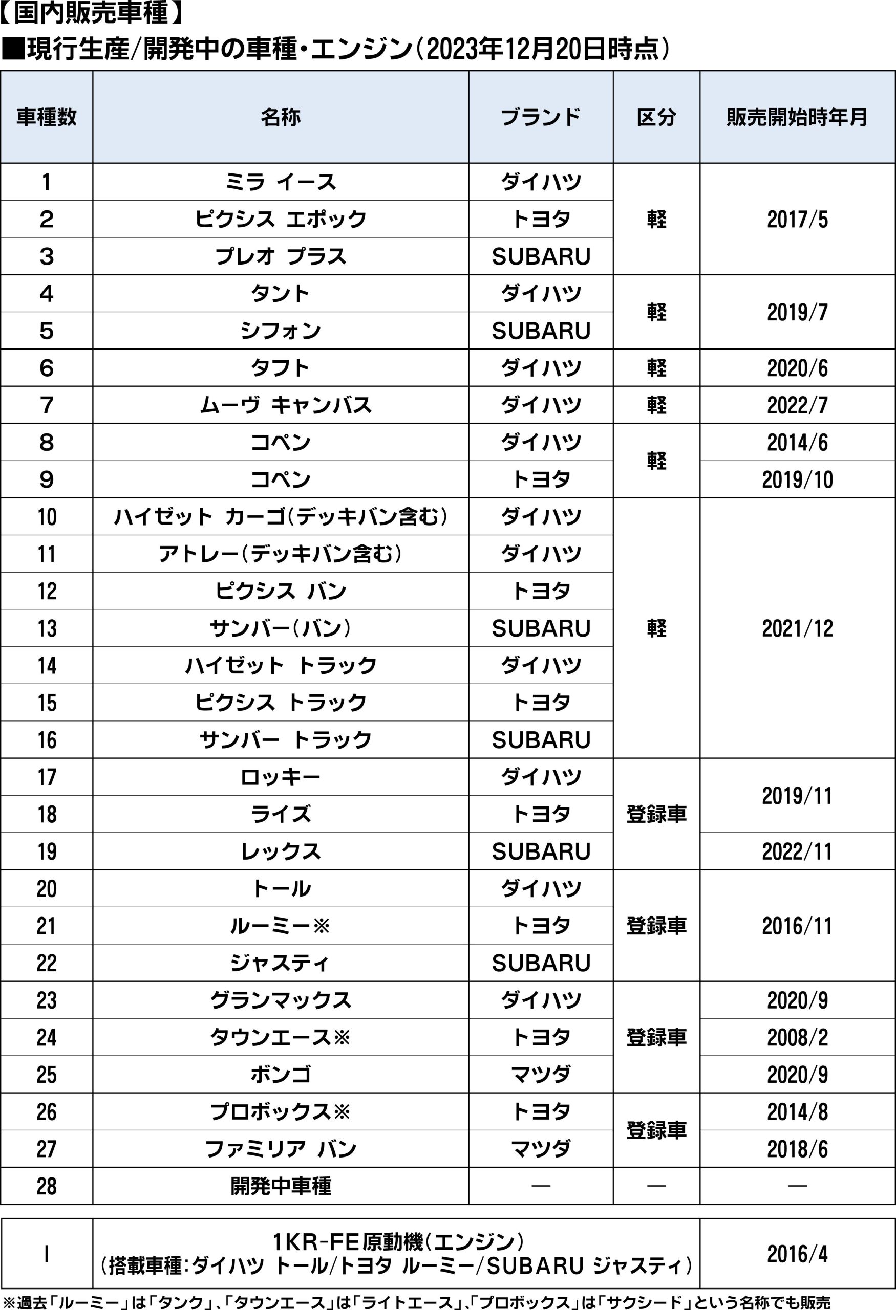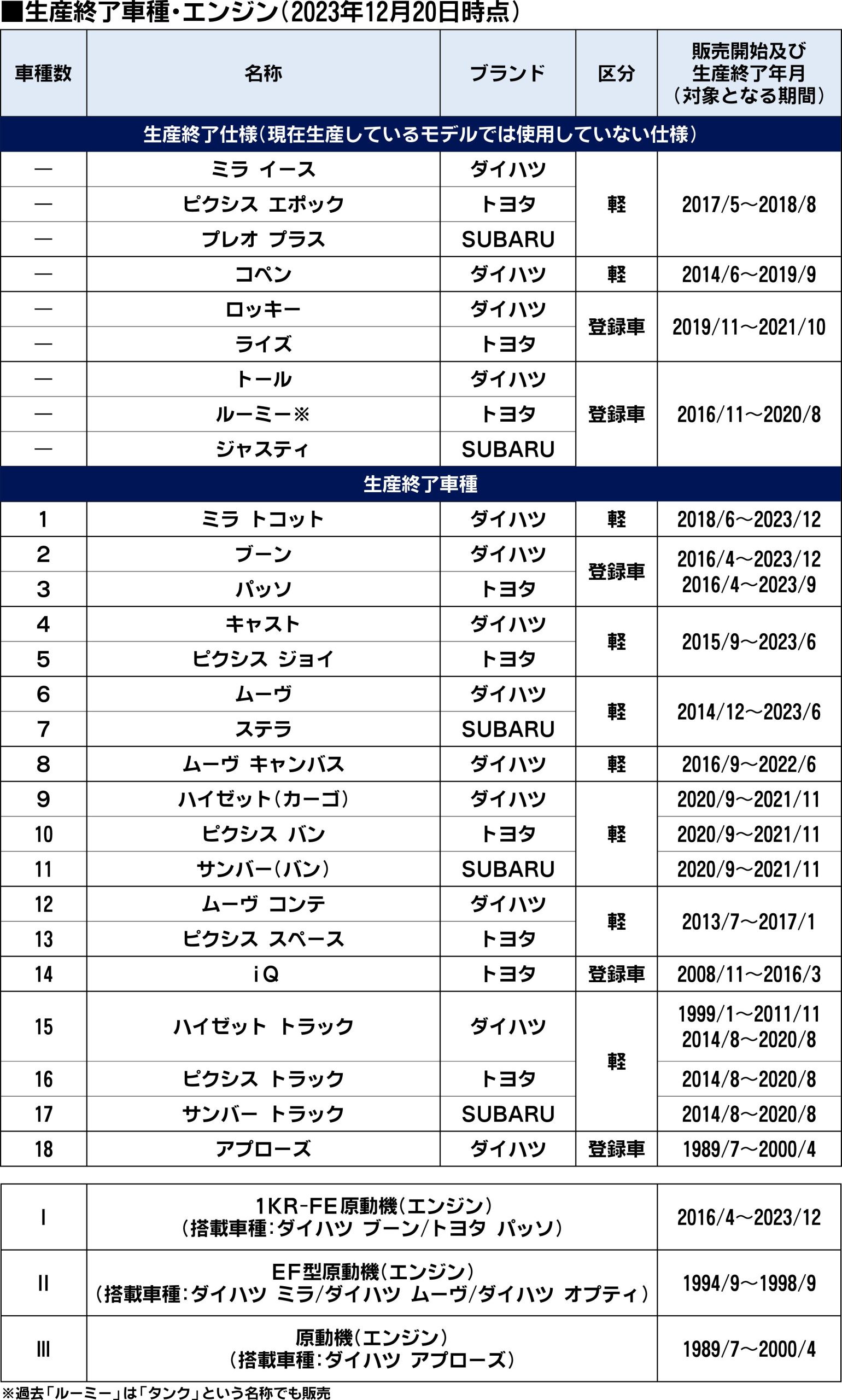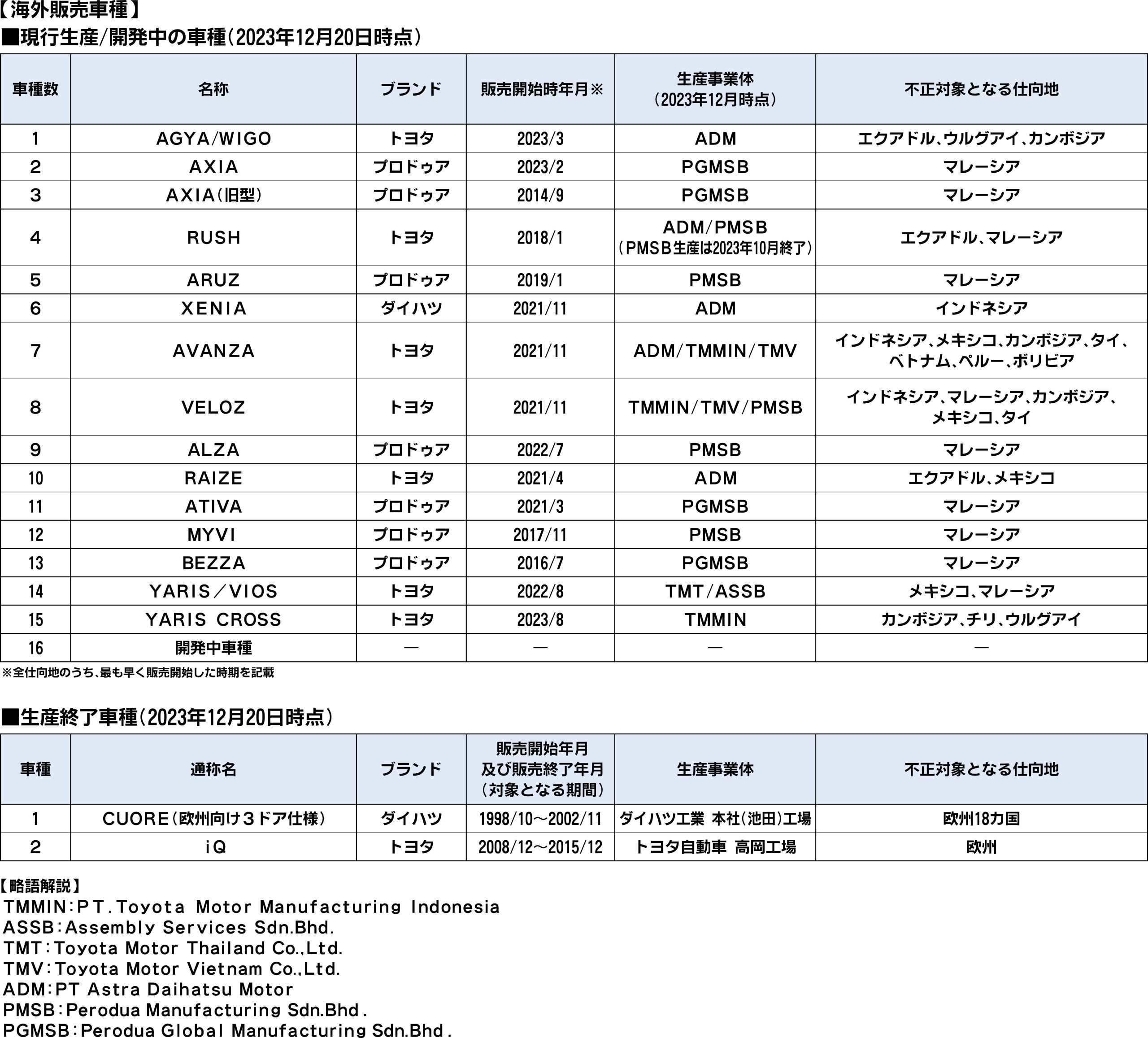 ダイハツ工業が12月20日に公表した今回新たに判明した認証試験不正の対象車種一覧を紹介する。対象車種は、国内販売車種、生産終了車種、海外販売車種の3つに分類。