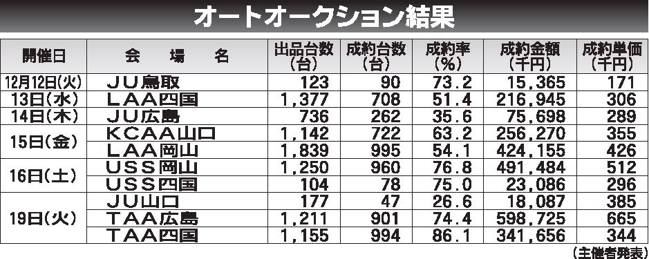 〈オートークション結果〉中四国地区 2023/12/22~19