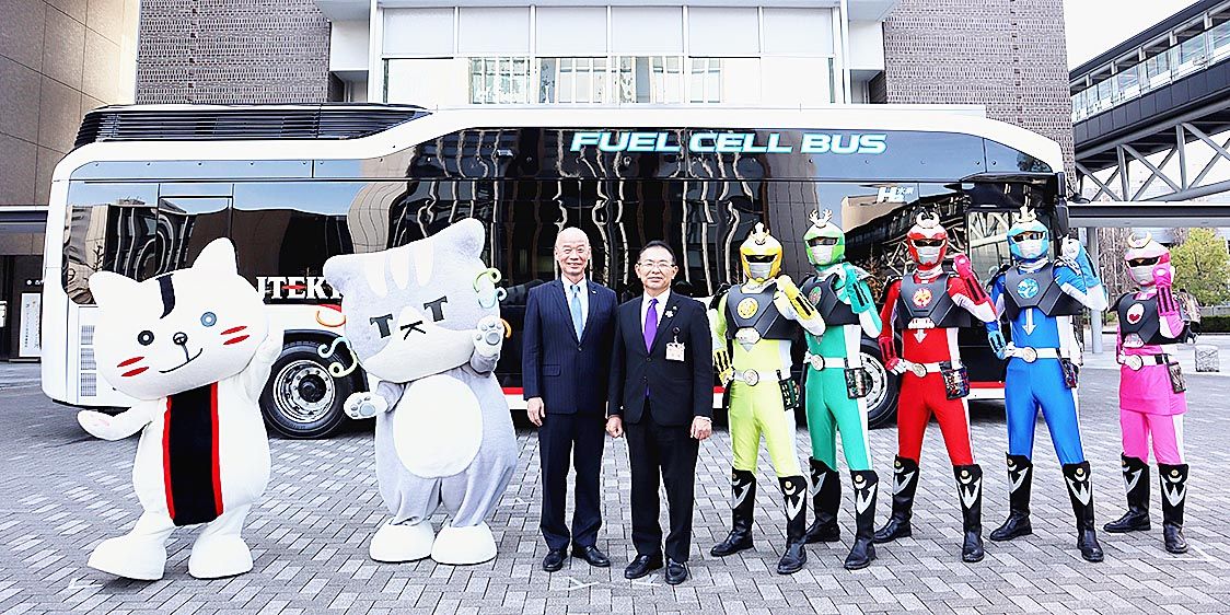 ジェイテクトは、愛知県岡崎市の花園工場に勤務する社員の通勤用に、トヨタ自動車の燃料電池(FC)バス「SORA」を導入すると発表した=写真はお披露目会の様子。同市のゼロカーボンシティへの取り組みに賛同し、東岡崎駅と花園工場を結ぶ通勤バスに導...