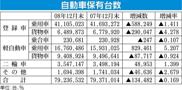 国内の自動車保有台数の減少傾向が顕著になっている。自動車検査登録情報協会などが10日に発表した「自動車保有車両数」の統計によると、2008年末時点での国内自動車保有台数は7923万6532台となり、暦年としては2年連続で減少した。前年同月...