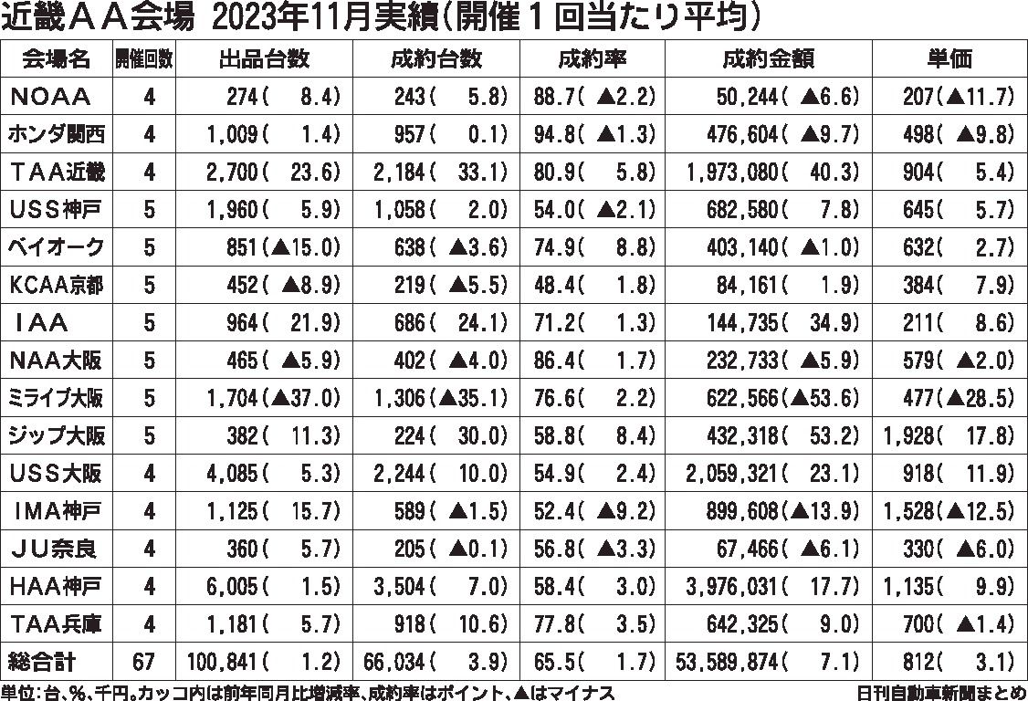 近畿地区にある中古車オークション(AA)15会場の11月実績がまとまった。開催回数は計67回で、前年同月比2回増。出品台数は同1・2%増の10万841台で、4年ぶりに11月単月で10万台を超えた。他の項目についても前年同月に比べ伸びを示し...