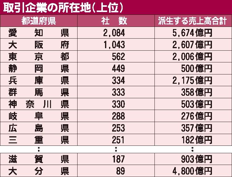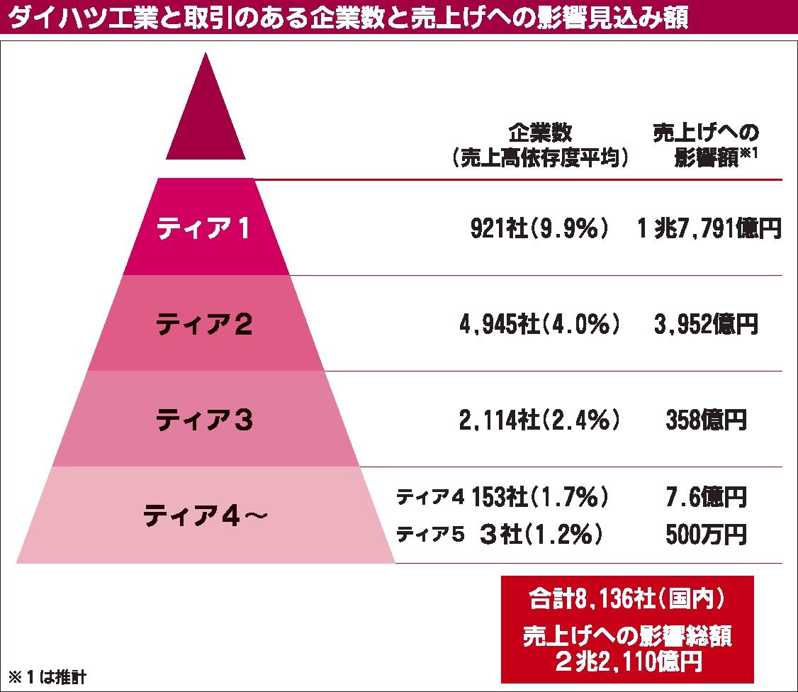 ダイハツ工業の認証不正による出荷停止の影響が懸念されている。帝国データバンクが21日に公表した調査結果によると、ダイハツ工業の国内取引先は8136社、売上高への影響総額は2兆2110億円にのぼる。特に売上高(全体平均)の約1割をダイハツに...