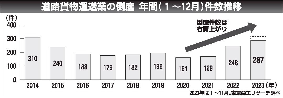 東京商工リサーチ(河原光雄社長、東京都千代田区)は、道路貨物運送業者の2023年倒産件数が過去10年で「最多」となる可能性が高いとの見通しを公表した。1~11月の倒産件数が前年同期比31・6%増の287件となり、14年以来9年ぶりに年間3...