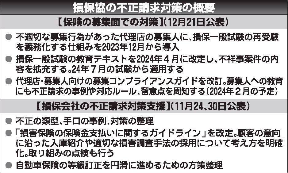 日本損害保険協会(損保協、新納啓介会長=あいおいニッセイ同和損害保険社長)は、不適切な行為があった保険代理店の募集人に「損保一般試験」の再受験を義務化する制度を導入した。ビッグモーター(和泉伸二社長、東京都多摩市)の自動車保険金の不正請求...